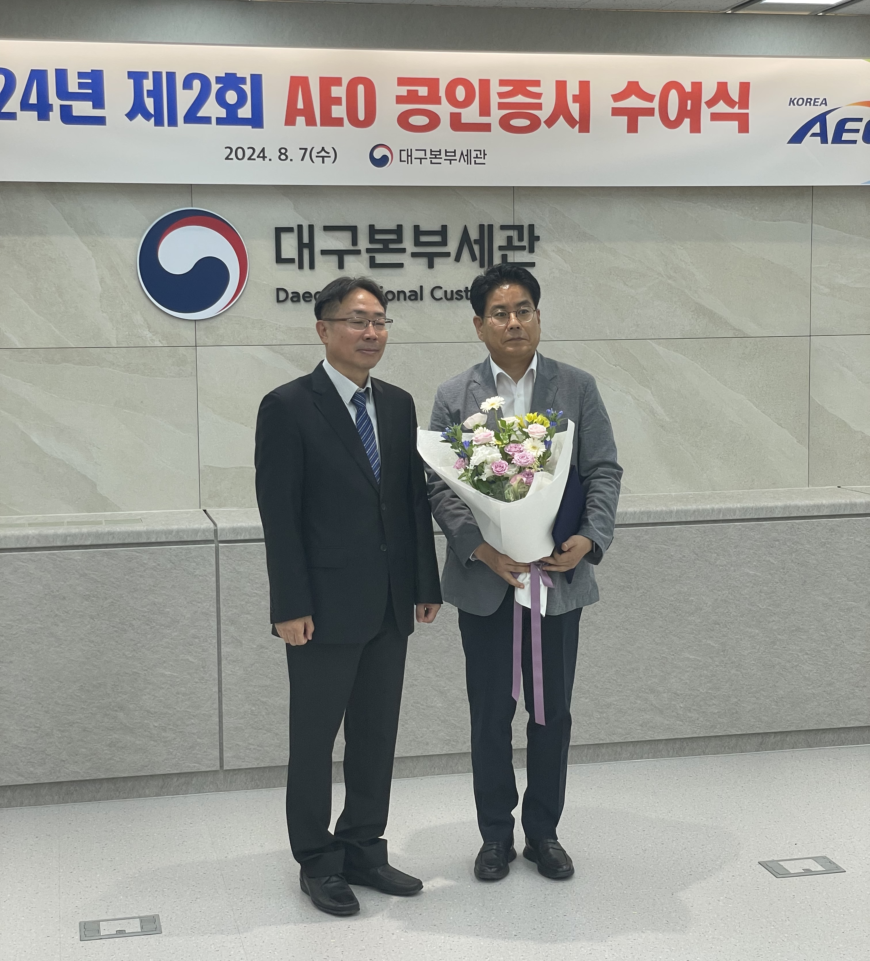 지난 7일, 우리 회사는 대구본부세관 주관 하에 수출입안전관리우수업체(AEO) 인증을 갱신했습니다. AEO란 관세청에서 ▲법규준수, ▲내부 통제 시스템, ▲재무건전성 등의 공인 기준 적정성을 심사해 공인한 우수업체를 뜻합니다. AEO 인증에는 AEO 상호인정약정에 따라 미국·중국 등 24개 주요 교역 국가에서도 상대국 AEO 기업과 동일한 통관 혜택을 적용 받을 수 있다는 이점이 있습니다. 우리 회사는 지난 2019년 최초 공인 인증을 획득한 이후 5년이 경과한 지난해부터 법규준수부문 및 공인인증부문에 대한 AEO 종합 심사를 거쳐 최종 갱신 승인을 받게 되었습니다. 앞으로도 AEO 인증에 힘입어 전세계를 누빌 우리 회사의 모습을 기대해주세요.