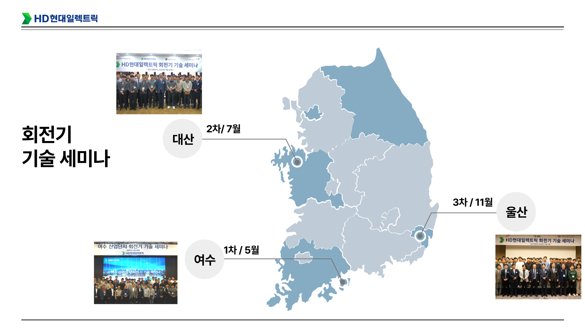 회전기국내영업부는 각 세미나에 산단별 특성을 반영한 맞춤형 발표 자료를 준비했습니다. 특히 이번 울산에서는 전동기 예방진단 시스템과 동기 전동기·축발전기 등 제품 소개하고, 유지보수 실패 사례를 공유하여 실제 제품을 사용하는 고객들에게 와닿도록 했습니다.