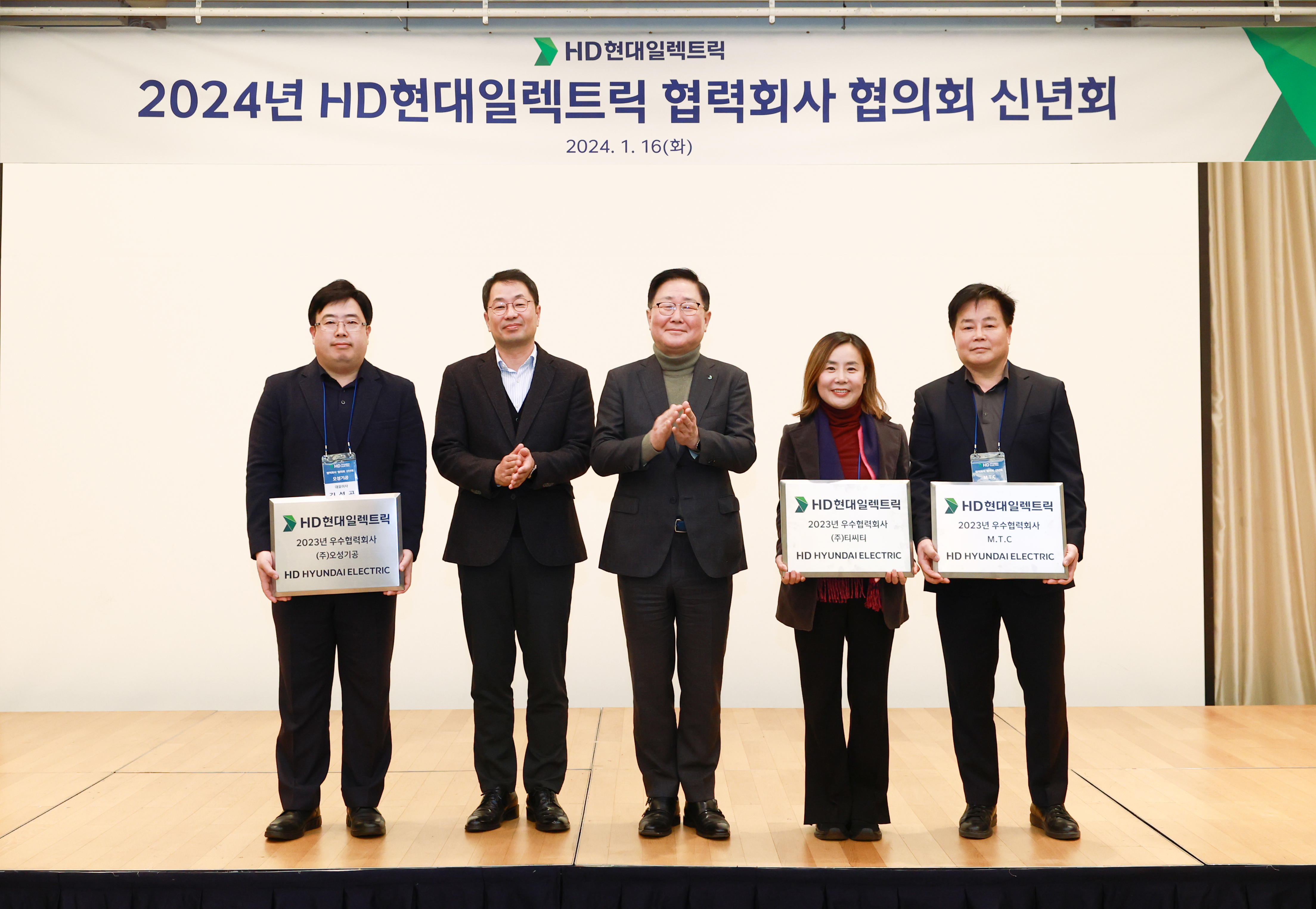 우리 회사는 지난 16일 협력회사 협의회 신년회를 개최했습니다. 이날 행사에는 조석 사장 이하 경영진이 참석했고, 협력회사 협의회 46개 사 대표들도 자리를 빛냈습니다. 조석 사장은 우수협력회사 5개 사를 포상하며, 지난 한 해의 노고를 치하했습니다. 24년에도 HD현대일렉트릭과 협력회사들이 만들어 나갈 희망찬 미래를 응원해주세요.